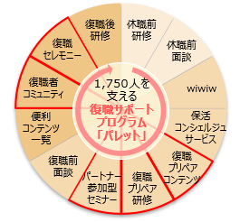 三菱UFJ銀行では、産育休者・復職者を支援する既存の施策に加え、以下の新たなコンテンツを追加し、2023年10月より、「産育休復職サポートプログラム(通称:パレット)」としてパッケージで展開しています。